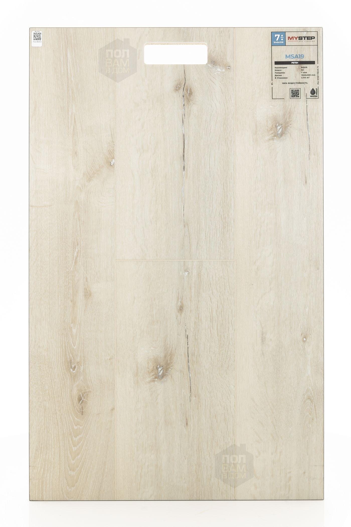 SPC ламинат My Step Реген MSA19 - цена 3 590 руб. за квадратный метр. Это покрытие толщиной 7 мм, порода дерева - дуб, фаска с 4-х сторон. Тиснение поверхность SPC ламината имеет светлый оттенок и матовый блеск. Для того, чтобы купить в интернет-магазине SPC ламинат из коллекции My Step Аква 7мм Реген MSA19, положите товар в корзину или свяжитесь с нами любым доступным способом. Товар есть в наличии.
