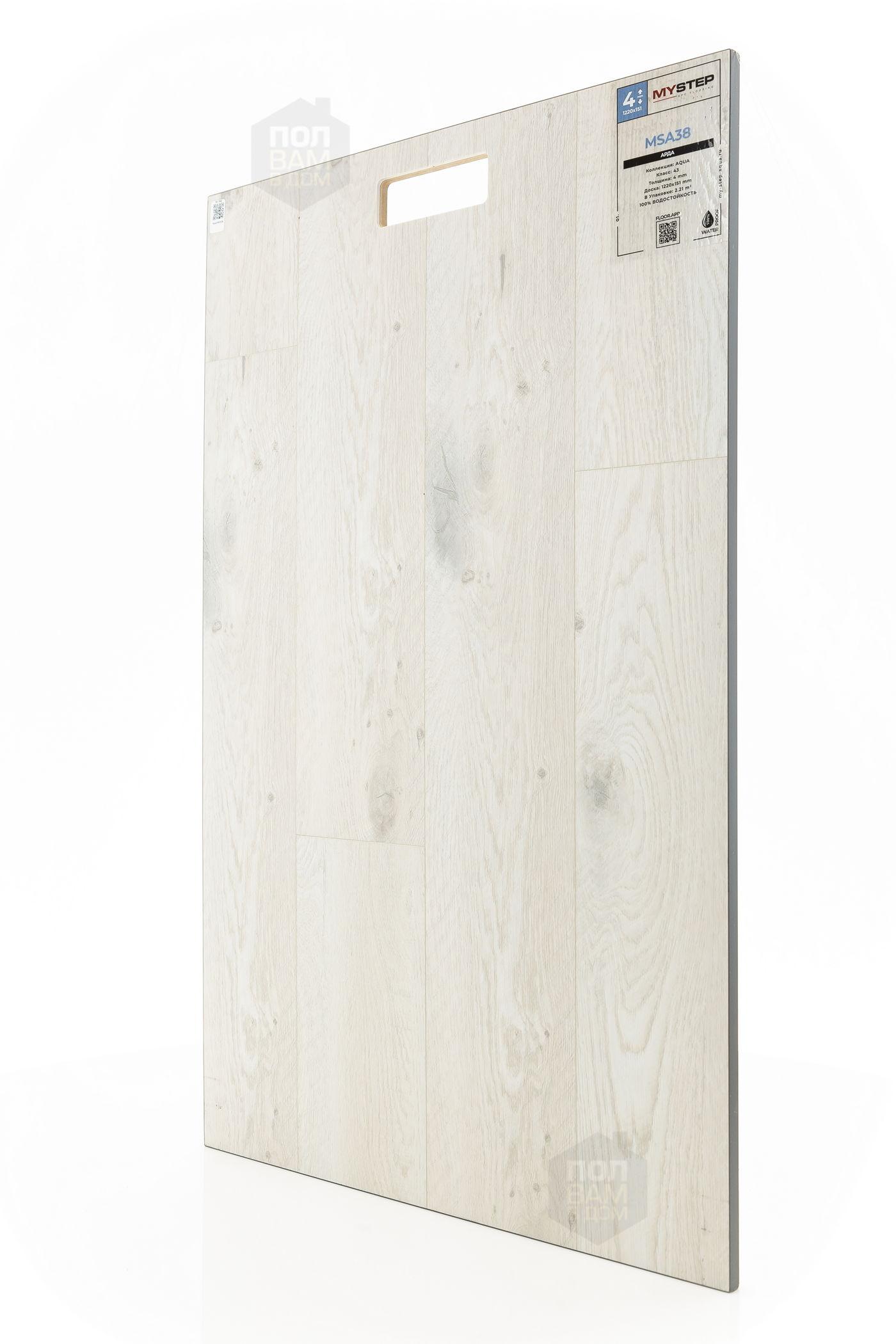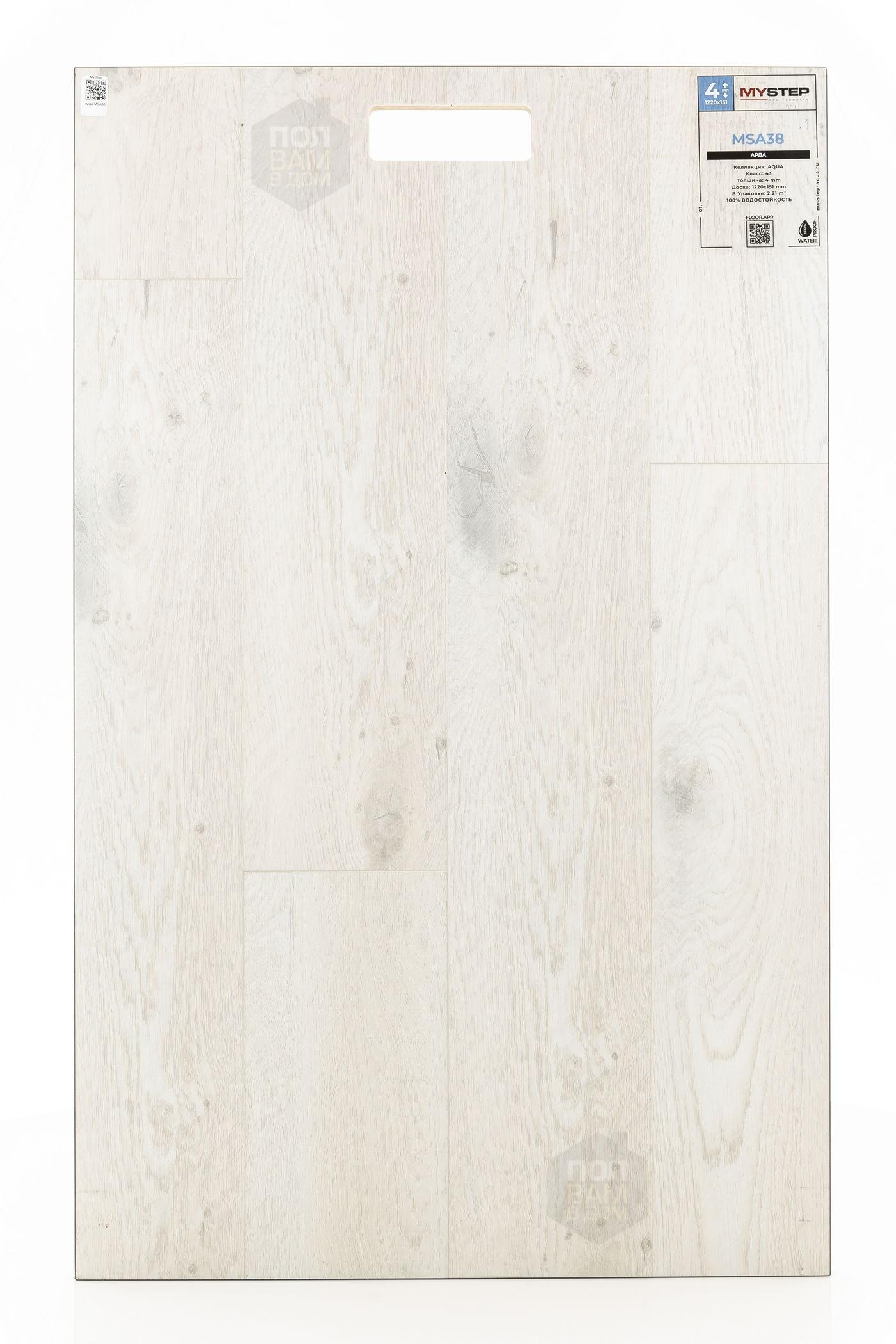 SPC ламинат My Step Арда MSA38 - цена 2 290 руб. за квадратный метр. Это покрытие толщиной 4 мм, порода дерева - дуб, фаска с 4-х сторон. Тиснение поверхность SPC ламината имеет светлый оттенок и матовый блеск. Для того, чтобы купить в интернет-магазине SPC ламинат из коллекции My Step Аква 4мм Арда MSA38, положите товар в корзину или свяжитесь с нами любым доступным способом. Товар есть в наличии.
