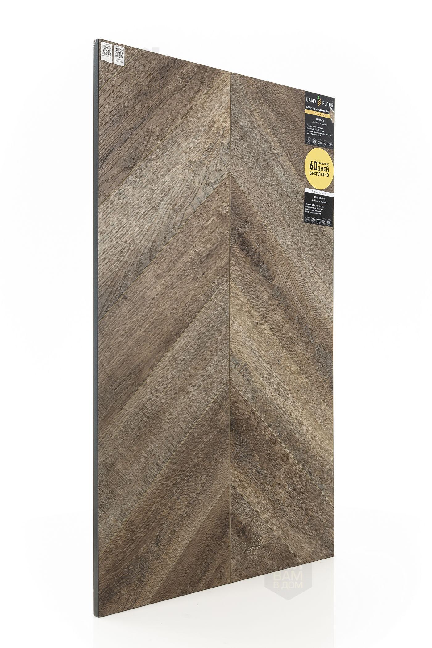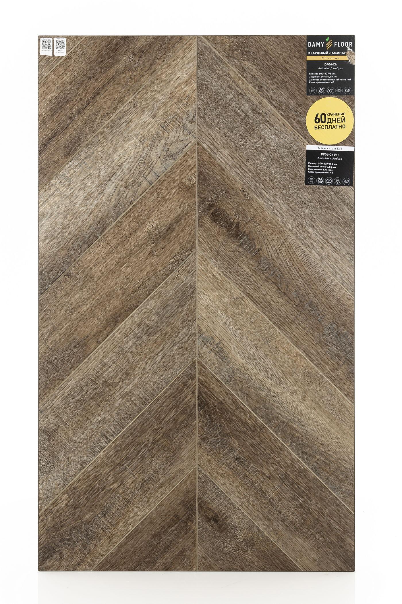 SPC ламинат Damy Floor Амбуаз DF06-Ch - цена 4 899 руб. за квадратный метр. Это покрытие толщиной 5 мм, порода дерева - дуб, фаска с 4-х сторон. Тиснение поверхность SPC ламината имеет светлый оттенок и матовый блеск. Для того, чтобы купить в интернет-магазине SPC ламинат из коллекции Damy Floor Chevron Амбуаз DF06-Ch, положите товар в корзину или свяжитесь с нами любым доступным способом. Товар есть в наличии.