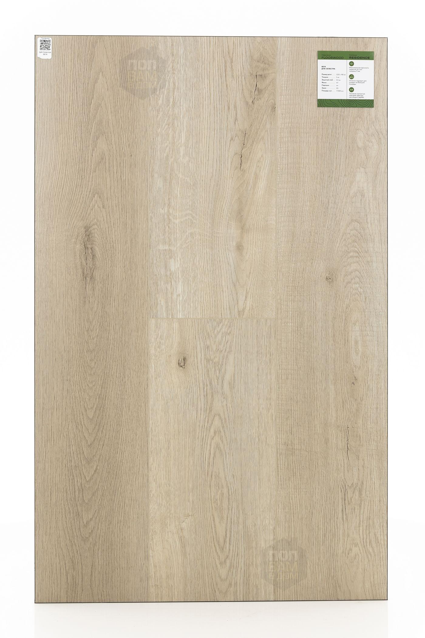 SPC ламинат Floorwood Дуб Селестра 8674 - цена 2 652 руб. за квадратный метр. Это покрытие толщиной 5 мм, порода дерева - дуб, фаска с 4-х сторон. Тиснение поверхность SPC ламината имеет светлый оттенок и матовый блеск. Для того, чтобы купить в интернет-магазине SPC ламинат из коллекции Floorwood Residence Дуб Селестра 8674, положите товар в корзину или свяжитесь с нами любым доступным способом. Товар есть в наличии.